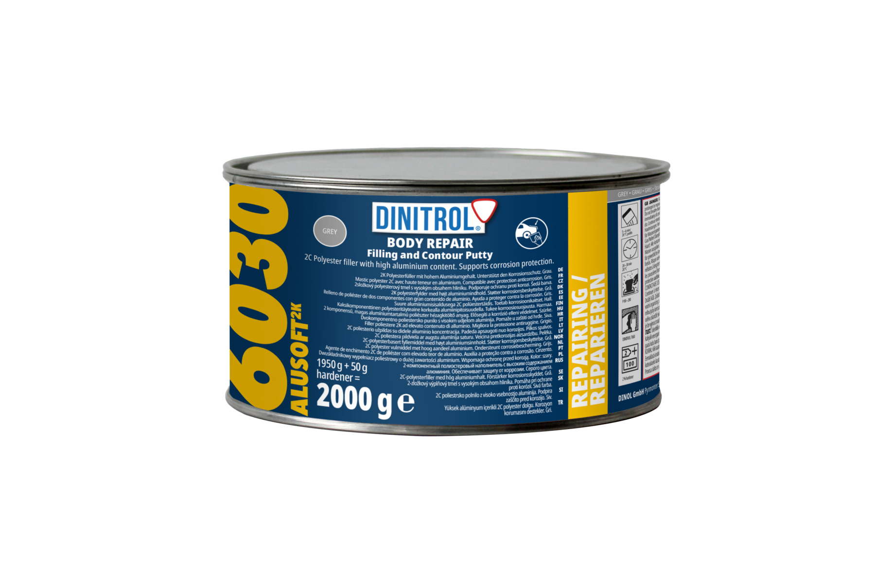 DINITROL 6030 Alusoft 2K to uniwersalna, 2‑składnikowa szpachlówka na bazie nienasyconych żywic poliestrowych, przeznaczona do napraw w karoserii pojazdów, konstrukcjach stalowych, obudowach maszyn oraz do renowacji podłoży mineralnych (beton, mur). Produkt jest zwarty i wolny od porów, zapewnia bardzo dobre własności „stojące” oraz wysoką adhezję do wielu podłoży, w tym stali, stali ocynkowanej, aluminium (zalecany test przy różnych stopach) i lakierów 2K.
