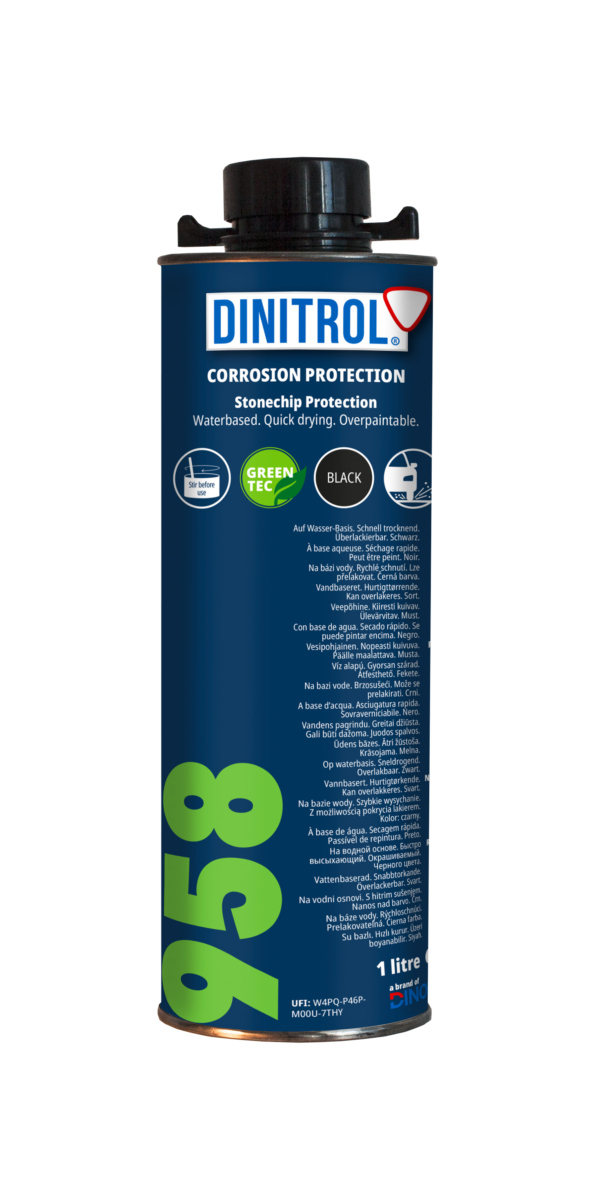 Dinitrol 958 zapewnia szybkoschnącą, czarną i elastyczną powłokę do ochrony najbardziej narażonych stref, takich jak progi drzwiowe, spoilery, zderzaki, nadkola i krawędzie. Przeznaczony do aplikacji na liniach produkcyjnych i w serwisie.