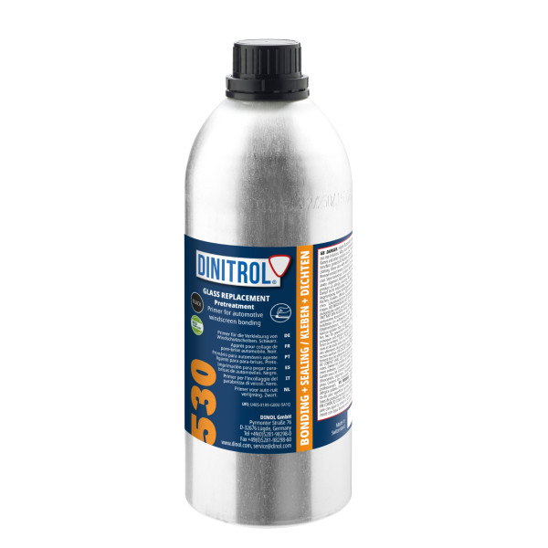 DINITROL 530 to rozpuszczalnikowy, fizycznie i chemicznie wysychający czarny podkład, który zwiększa przyczepność pomiędzy szkłem (w połączeniu z aktywatorem DINITROL 520), lakierem i klejami do bezpośredniego szklenia oraz zapewnia dodatkową ochronę przed promieniowaniem UV.